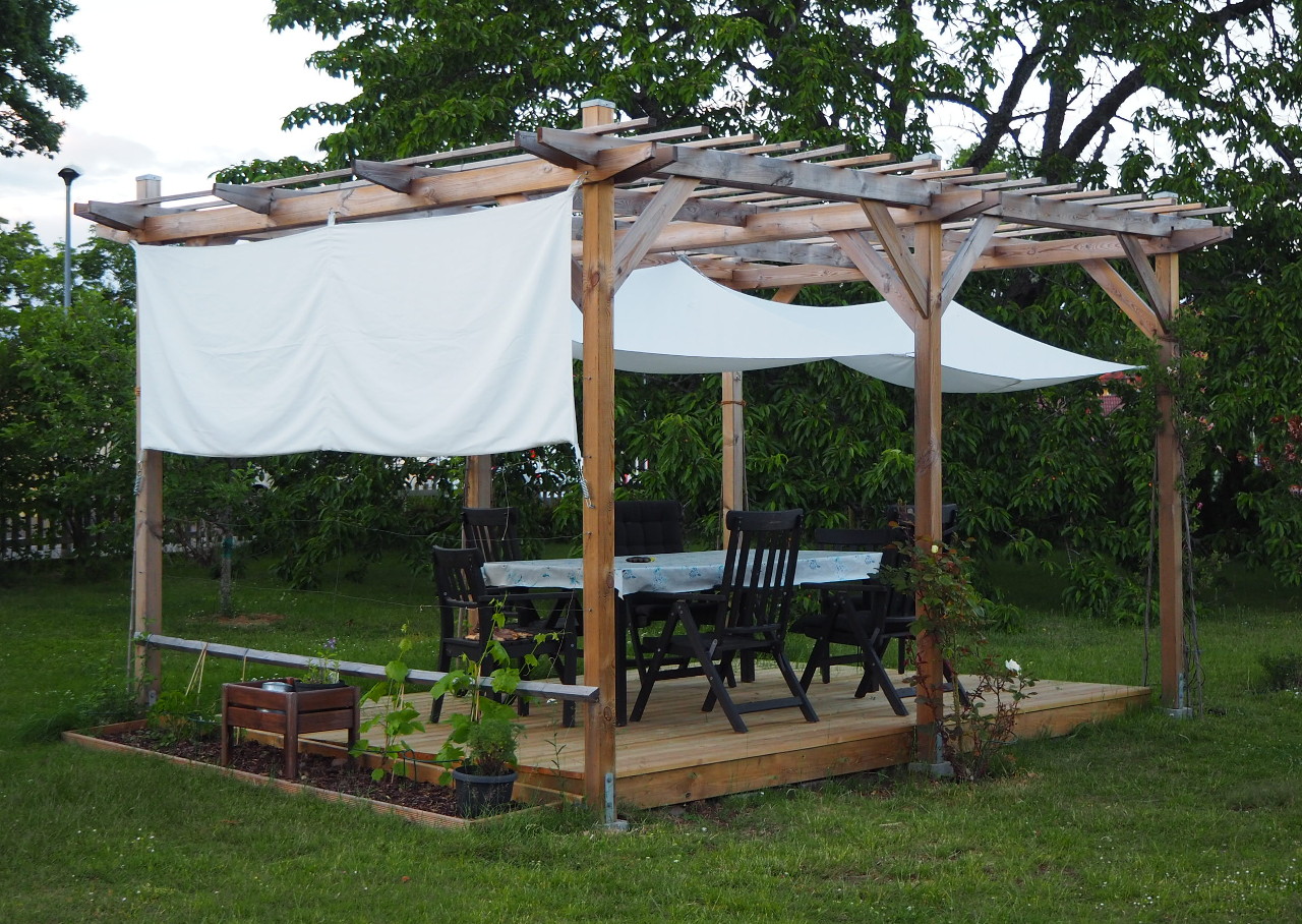 Zunächst einmal hat die Pergola einen Holzboden bekommen. Im Unterschied zur vormaligen Rasenfläche hat dieser kein nennenswertes Gefälle – der Tisch steht jetzt also waagerecht, und alle Tischgäste sitzen auf gleicher Höhe.