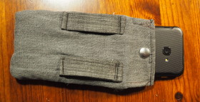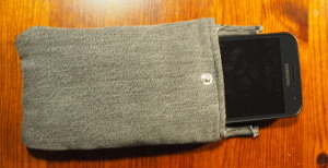 Es ist gepolstert, hat ein Innenfutter aus weicherem Stoff, und lässt sich mit einem Druckknopf verschließen – so dass das Telefon leicht hinein-, aber nicht so leicht herausgleitet.