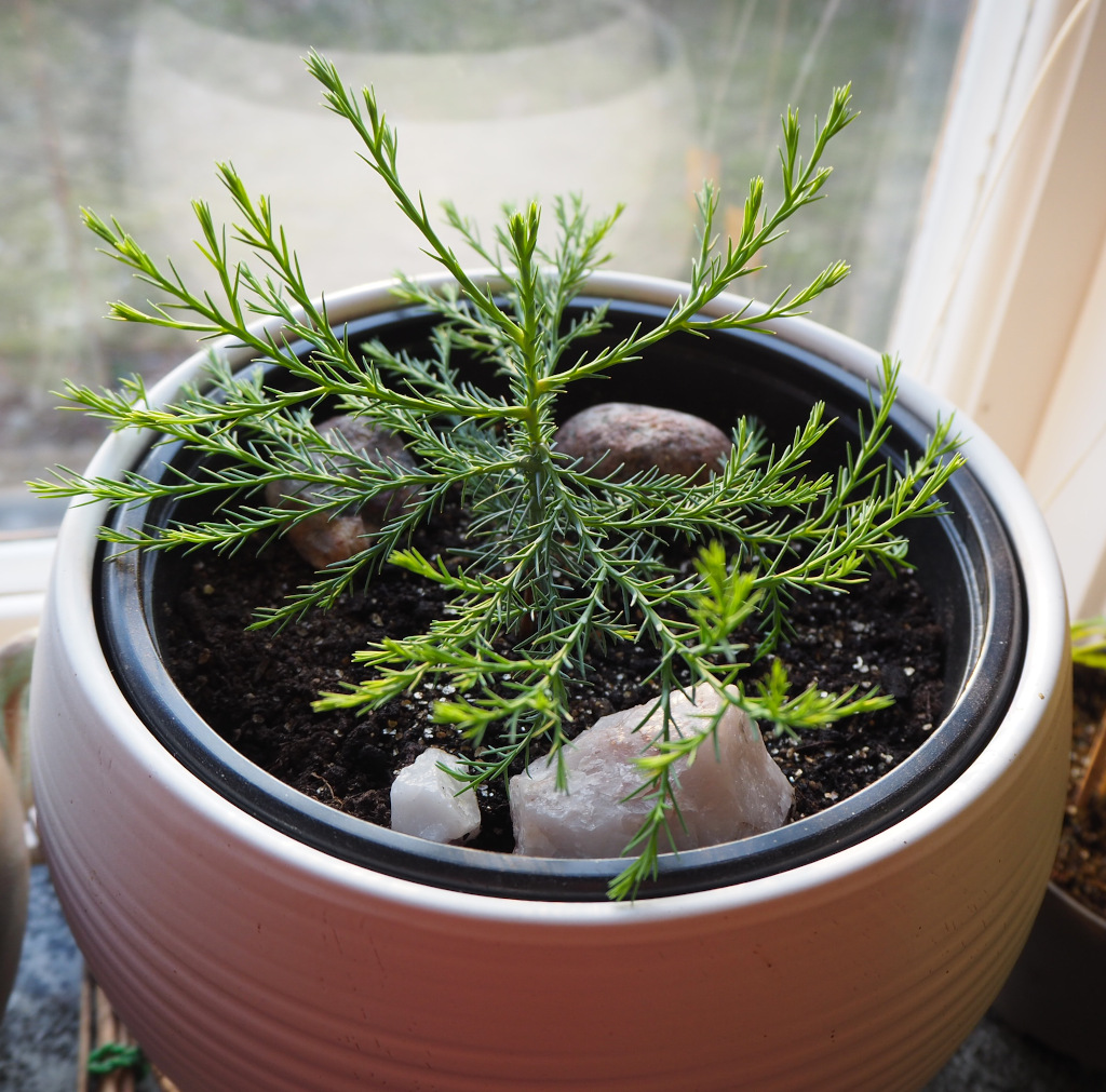 Inzwischen haben wir die 10cm-Marke überschritten, und jede Woche kommt ein neues Paar Seitentriebe dazu. Inzwischen hat das Bäumchen auch den Rand des Topfes entdeckt und die untersten Triebe nach oben gedreht, damit sie weiter hinaus kommen.