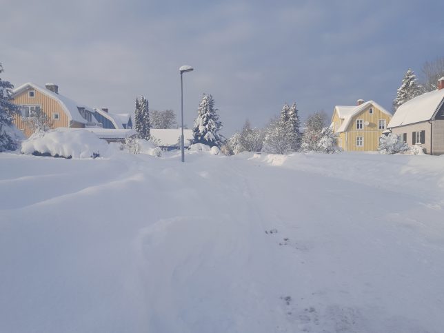 Inzwischen haben wir uns einigermaßen durchgegraben. Die meisten Feld- und Waldwege sind zwar komplett unpassierbar, aber größere Landstraßen sind wieder frei, ebenso wie die Straßen im Ort und die meisten Zu- und Einfahrten. Der Schnee ist auf etwa 50-60cm zusammengesackt, so dass man wieder drübergucken kann. Der Verkehr läuft wieder – trotzem weigert sich PostNord, Pakete auszuliefern. Das Dorf ähnelt einem Labyrinth aus Schneisen im Schnee, und an vielen Stellen sind die Straßen nur halb so breit wie sonst.