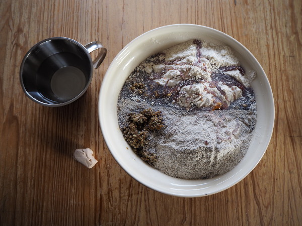 Die Zutaten werden etwa 5-7 Minuten lang gründlich verrührt, bis sie sich gleichmässig vermischt haben. Anders als beim Dinkelbrot bleibt dieser schwere Teig zähflüssig und klebrig und lässt sich nicht kneten.