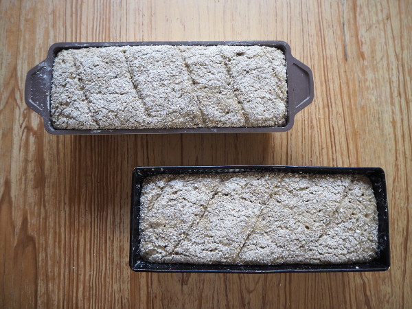 Inzwischen habe ich den Teig in zwei gut gefettete Backformen gefüllt, mit nassen Fingern glattgestrichen und dann mit etwas grobem Roggenmehl bestreut.